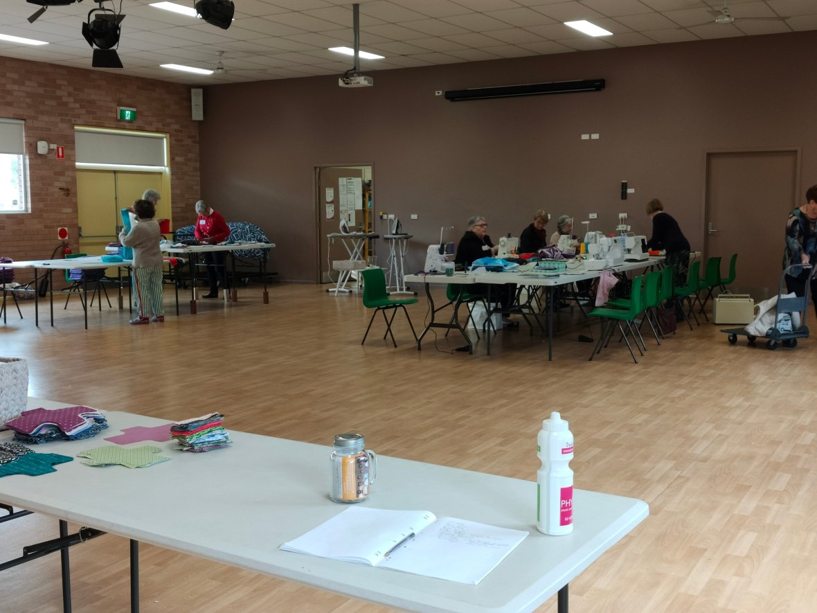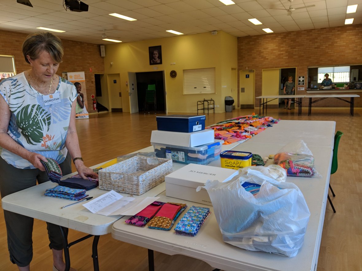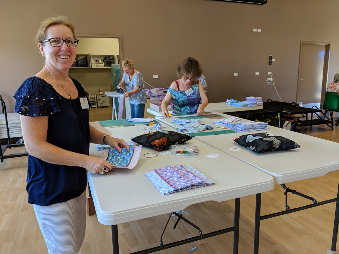 December Sewing day. As well as 45 kits we did a special order of 20 modified kits for women in the bush doing it tough. They will go to the Armidale region and be distributed there.